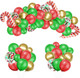 - Christmas Balloon Garland Includes: Designed with Christmas themed patterns included with different colour balloons, 20 x jade green (12"), 20 x ruby red (12"), 5 x confetti (12"), 15 x metallic gold (10"), 3 x Santa stick foil balloon (16"), 8 x metallic gold (5"), 8 x ruby red (5"), 8 x jade green (5"), 1pc of adhesive tape, 1pc of tape stripe
