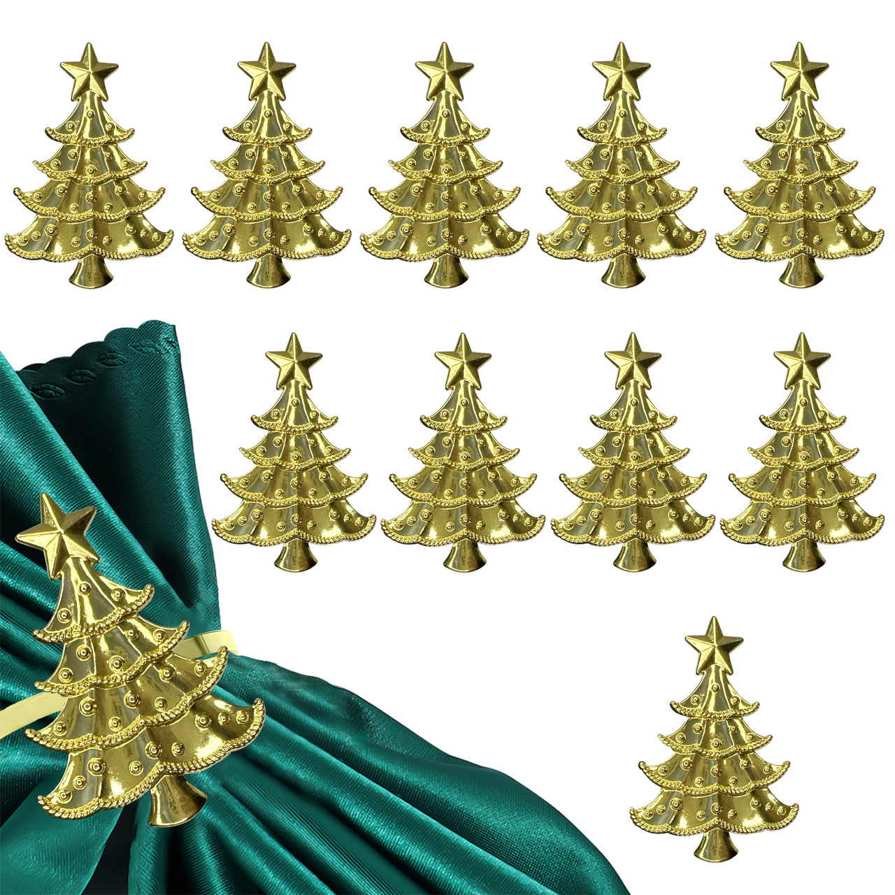 Bring festive charm to your dining setting with these gold Christmas tree napkin rings, each topped with a shining star. Their bright finish adds a touch of seasonal elegance, making them a beautiful addition to your Christmas table décor.