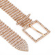 The belt has a chic design formed by eight rows of gold metal that are elegantly studded with crystal rhinestones to create an eye-catching and luxurious design.