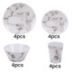 A 16-piece melamine marble dinner set: 4 dinner plates, 4 side plates, 4 bowls, and 4 mugs—durable, lightweight, and perfect for camping, caravans, motorhomes, or family picnics.