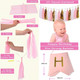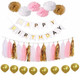 The set includes 8x gold 12" (30.5cm) latex balloons, white & gold Happy Birthday bunting, 20x pink, white & gold paper tassels, and 6 paper pom poms (pink, white & gold).