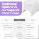 The wrinkle-free cover can be used on all shapes of banquet-style chair (except folding chairs) to provide an elegant theme and ambience to weddings, parties, events and conferences.