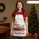 This buffalo plaid Christmas apron features a natural beige background with bright red trim. The centre displays a red-and-black check pickup truck carrying a green Christmas tree, with “Merry Christmas” elegantly printed above and below. Its cheerful, rustic design adds a stylish, festive touch to any kitchen.
