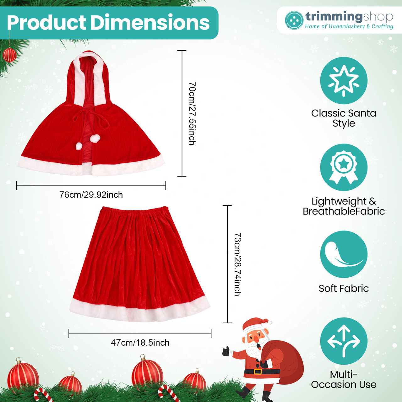 The set includes a red velvet hooded cape and matching skirt. Lightweight, reusable, and simple to fold, it stores easily for use year after year - an excellent addition to any festive wardrobe or a thoughtful gift for Christmas enthusiasts.